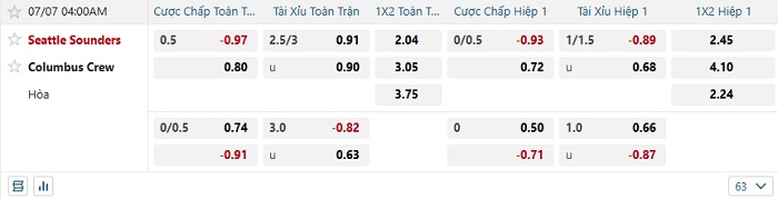 Tip kèo Châu Á hiệp 1 Seattle Sounders vs Columbus Crew