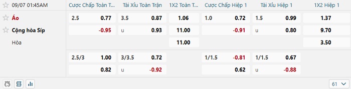 - Dự đoán tỷ số hiệp 1: Áo 1 – 0 Síp