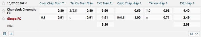 Tip kèo Châu Á hiệp 1 Chungbuk Cheongju vs Gimpo