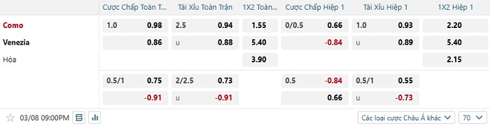 Tip kèo Châu Á hiệp 1 Como vs Venezia