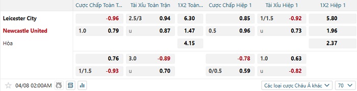 Tip kèo Châu Á full trận Leicester vs Newcastle