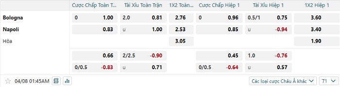 Tip kèo Châu Á full trận Bologna vs Napoli