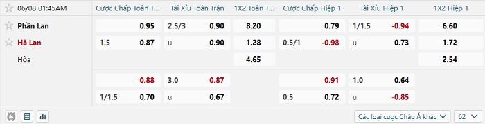 Tip kèo Châu Á hiệp 1 Phần Lan vs Hà Lan