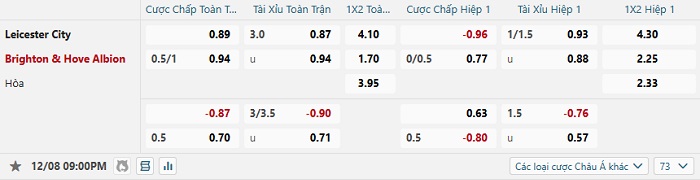 Tip kèo Châu Á hiệp 1 Leicester vs Brighton