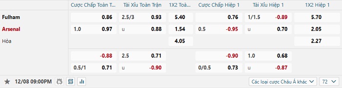 Tip kèo Châu Á full trận Fulham vs Arsenal
