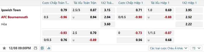 Tip kèo Châu Á hiệp 1 Ipswich vs Bournemouth