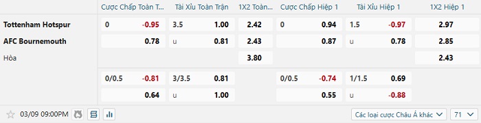 Tip kèo Châu Á hiệp 1 Tottenham vs Bournemouth