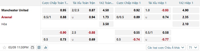 Tip kèo Châu Á hiệp 1 Man United vs Arsenal