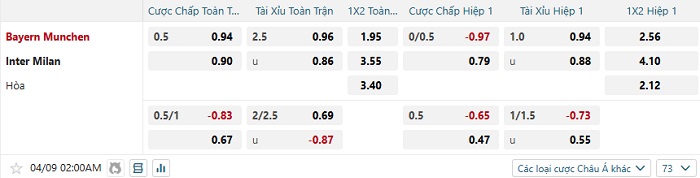 Tip kèo Châu Á hiệp 1 Bayern Munich vs Inter Milan