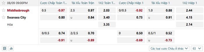 Tip kèo Châu Á hiệp 1 Middlesbrough vs Swansea