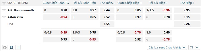 Tip kèo Châu Á hiệp 1 Bournemouth vs Aston Villa