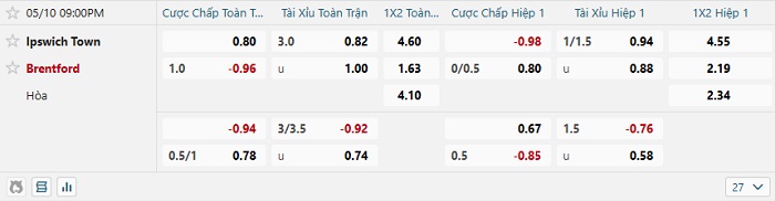- Dự đoán tỷ số hiệp 1: Ipswich 0 – 1 Brentford