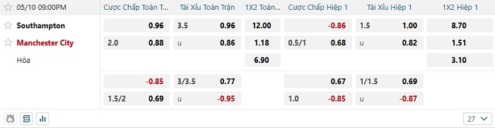 Tip kèo Châu Á hiệp 1 Southampton vs Man City