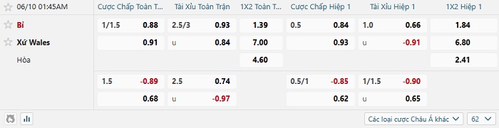 Tip kèo Châu Á hiệp 1 Bỉ vs Wales