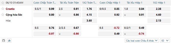 Tip kèo Châu Á hiệp 1 Croatia vs CH Séc