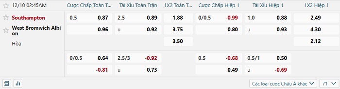Tip kèo Châu Á hiệp 1 Southampton vs West Brom