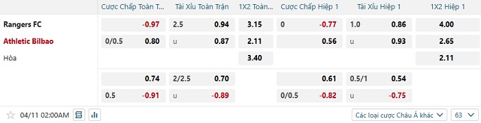 Tip kèo Châu Á full trận Rangers vs Bilbao