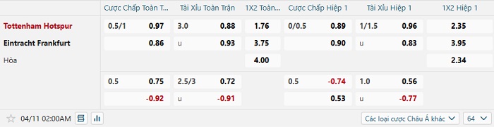 Tip kèo Châu Á hiệp 1 Tottenham vs Frankfurt