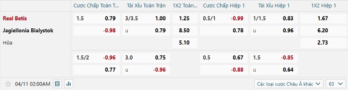 Tip kèo Châu Á full trận Betis vs Jagiellonia
