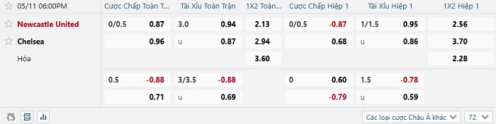 Tip kèo Châu Á full trận Newcastle vs Chelsea