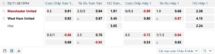 Tip kèo Châu Á hiệp 1 Man United vs West Ham