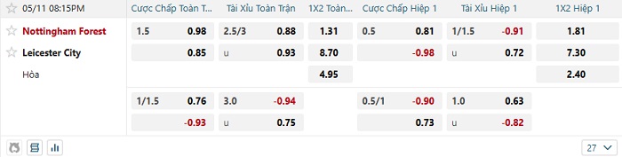 Tip kèo Châu Á hiệp 1 Nottingham vs Leicester