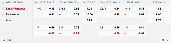 Tip kèo Châu Á hiệp 1 Legia Warszawa vs FK Aktobe