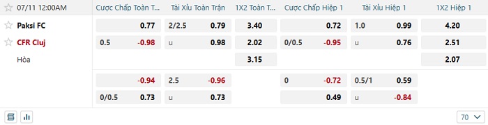 Tip kèo Châu Á hiệp 1 Paksi vs CFR Cluj