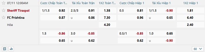 Tip kèo Châu Á hiệp 1 Sheriff Tiraspol vs FC Prishtina