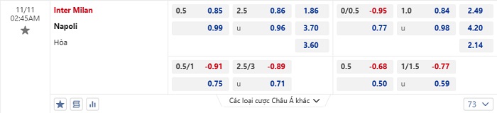 Tip kèo Châu Á hiệp 1 Inter Milan vs Napoli