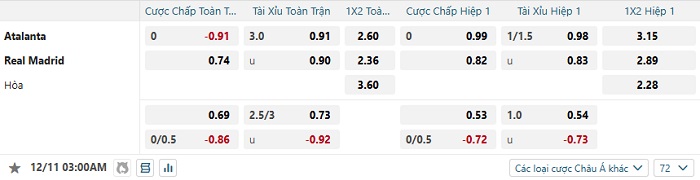Tip kèo Châu Á hiệp 1 Atalanta vs Real Madrid