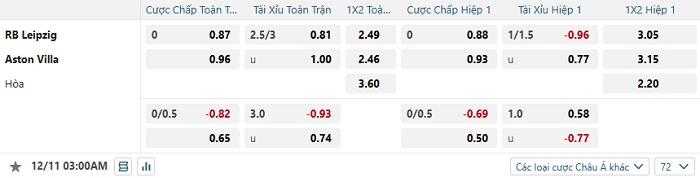 Tip kèo Châu Á full trận Leipzig vs Aston Villa