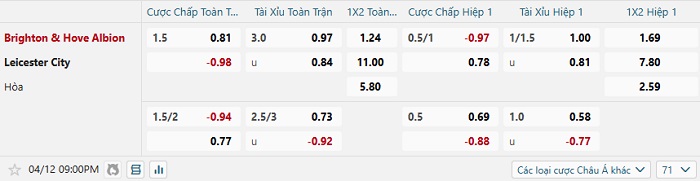 Tip kèo Châu Á full trận Brighton vs Leicester