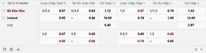 Tip kèo Châu Á full trận Bồ Đào Nha vs Ireland