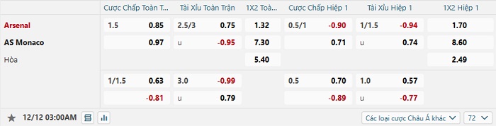 Tip kèo Châu Á hiệp 1 Arsenal vs Monaco