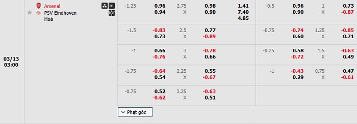 Tip kèo Châu Á hiệp 1 Arsenal vs PSV