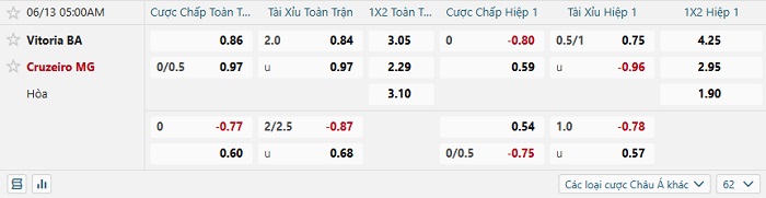 Tip kèo Châu Á full trận Vitoria vs Cruzeiro