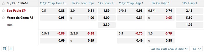 Tip kèo Châu Á hiệp 1 Sao Paulo vs Vasco da Gama
