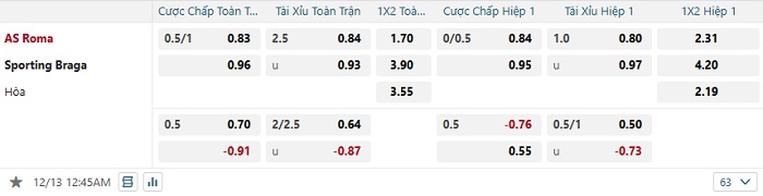 Tip kèo Châu Á full trận Roma vs Sporting Braga