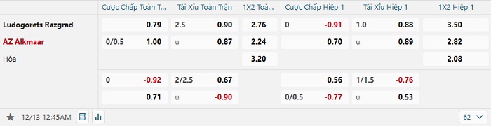 Tip kèo Châu Á full trận Ludogorets vs Alkmaar
