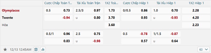 Tip kèo Châu Á hiệp 1 Olympiacos vs Twente