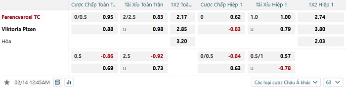 Tip kèo Châu Á full trận Ferencvarosi vs Viktoria Plzen