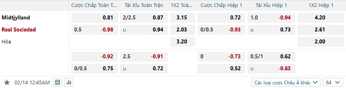 Tip kèo Châu Á hiệp 1 Midtjylland vs Real Sociedad