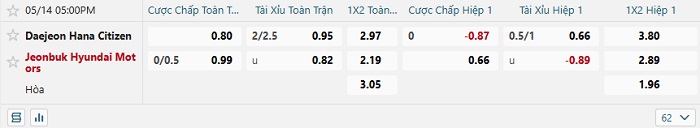 Tip kèo Châu Á hiệp 1 Daejeon Hana vs Jeonbuk Hyundai