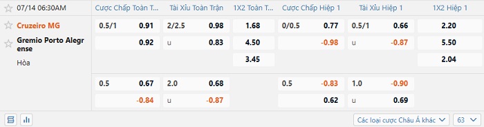 Tip kèo Châu Á full trận Cruzeiro vs Gremio