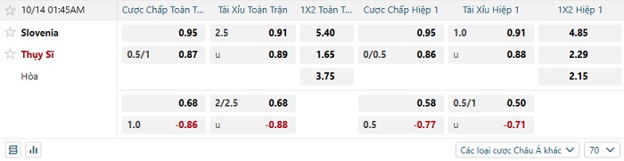 Tip kèo Châu Á full trận Slovenia vs Thụy Sĩ