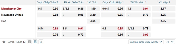 Tip kèo Châu Á full trận Man City vs Newcastle