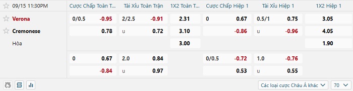 Tip kèo Châu Á hiệp 1 Verona vs Cremonese