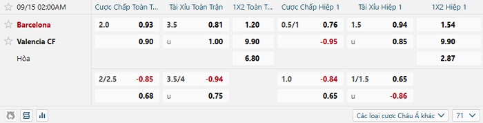 Tip kèo Châu Á full trận Barcelona vs Valencia
