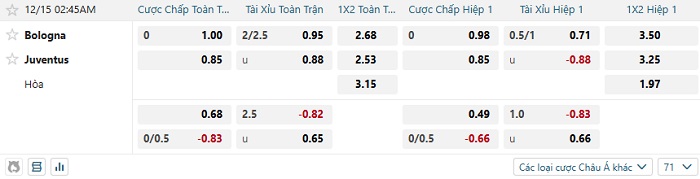 Tip kèo Châu Á hiệp 1 Bologna vs Juventus